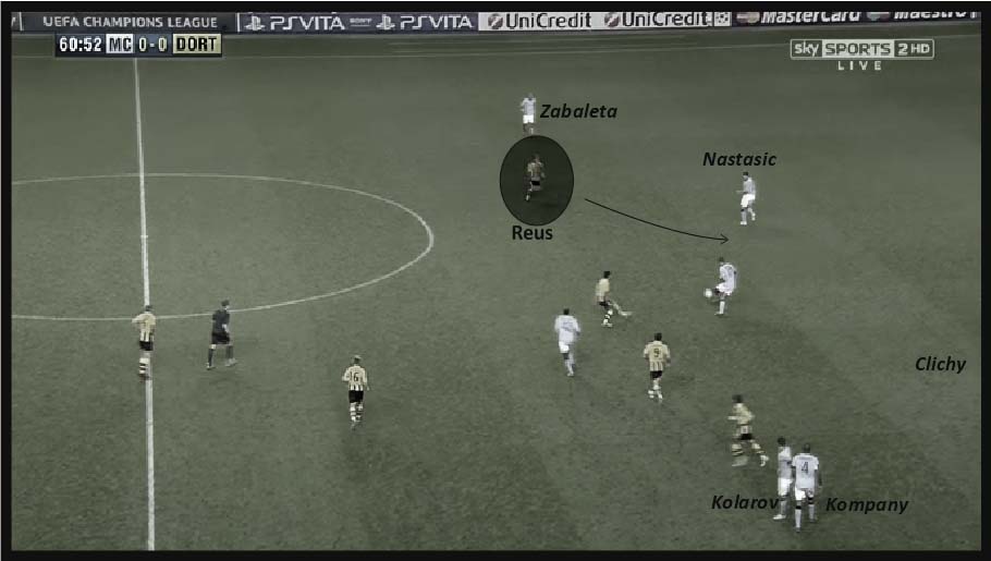 En estas capturas vemos el sistema de despliegue. En la primera un robo de Götze sobre Nastasic y las consecuencias. La posición central de Lewandowski sirve como eje de la transición, y la de de Götze y Reus en los dos perfiles exteriores les permite atacar la espalda despejada de Clichy y Zabaleta. La segunda imagen pertenece al 0-1. Mancini ya había corregido, intentando limpiar la salida con el 3-5-2 y dándole amplitud a su defensa con dos centrales a los lados de Kompany. De hecho, se aprecia que con el belga fuera de sitio, Nastasic y Clichy (que no aparece en imagen), ocupan el espacio ante un posible despliegue. Lo significativo es la actitud de Reus, cruzando para interceptar, en un gesto de lo que quería Klopp: despliegues rápidos con robos en ¾.