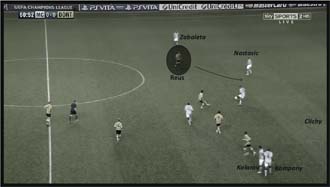 En estas dos primeras capturas vemos al equipo defendiendo la salida del Manchester City. En la primera, Lewandowski entre Yaya Touré y Javi García basculando sobre el poseedor, Blaszczykowski y Gündogan proyectados por delante de Bender para interceptar la conducción o el pase de cualquiera de los dos, y Götze y Reus evitando la recepción de los laterales. En la segunda, Zabaleta encuentra a Silva, pero Reus puede acercarse, Gündogan bascular y Schmelzer ya le está vigilando previamente de cerca. Para el City era casi imposible encontrar receptores en ¾ por lo bien que estaban protegidas las líneas de pase interiores, y el trabajo sobre las recepciones exteriores era muy preciso, por lo que el juego del City allí tampoco encontraba continuidad. La única opción del equipo de Mancini era balón directo de los centrales a la espalda de la defensa del Dortmund, que priorizaba achicar y por lo tanto dejaba espacio hasta su portería.
