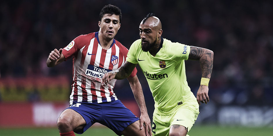 Con Lemar por izquierda, como volante del 4-4-2, Simeone confeccionó su propuesta a partir de un bloque medio-bajo en el que Saúl y Rodrigo, como doble pivote, y Koke, desde el otro perfil, priorizaron en todo momento la defensa posicional del espacio. De esta forma, con la iniciativa en su poder, Valverde respondió a través de la pizarra con un esquema ciertamente coherente con el guion que estaba por desarrollase. Sin Rakitic ni Coutinho, el FC Barcelona saltó al Wanda Metropolitano con una especie de 4-4-2 en rombo, en el que Vidal, más adelantado que Arthur, Busquets y Sergi Roberto, sirvió como teórico enlace entre el medio campo y la última parcela. Desde dicho dibujo (4-3-1-2), el chileno pudo mantener así su rol entre líneas, fijando un apoyo en vertical a los principales pasadores del colectivo, y además consiguió acaparar la atención de Rodrigo desde una zona clave para los intereses de ambos equipos.