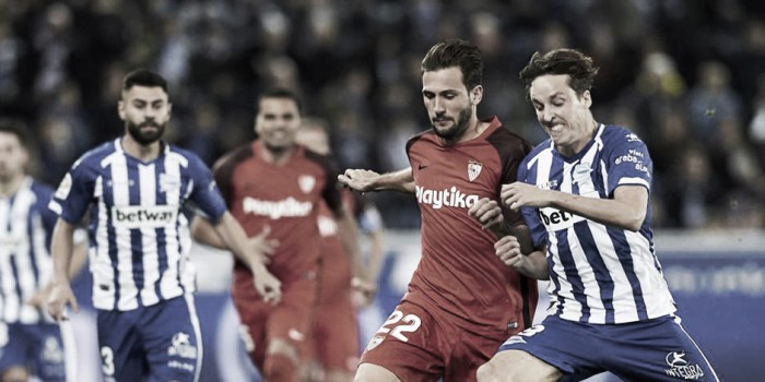 En clave local, el Alavés utilizó uno de sus pliegues previstos para determinados encuentros, modificando su 4-4-2 por un 4-5-1, con un centrocampista más, con el que, a diferencia de otros ejemplos pretéritos, caso de la visita del Real Madrid, no tuvo una intención de reforzar su defensa organizada en campo propio, sumando efectivos, piernas y capacidad extra de llegar a los costados en la basculación con un mediocentro ajustando por detrás de dos interiores. La idea, por contra, estuvo enfocada en jugar en todo momento en campo del Sevilla, tanto para asegurarse superioridad en la circulación como para presionar con ahínco al trío de medios característico del hasta ayer líder: Roque Mesa, Ever Banega y Mudo Vázquez.